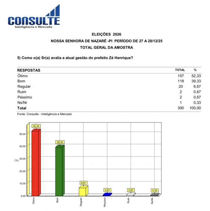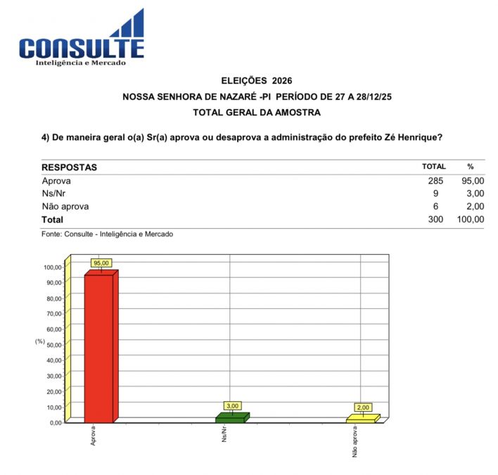 A gestão do prefeito Zé Henrique (PSD), em Nossa Senhora de Nazaré, é aprovada por 95% da população do município, segundo dados de uma pesquisa pesquisa realizada pelo instituto Consulte Inteligência e Mercado.